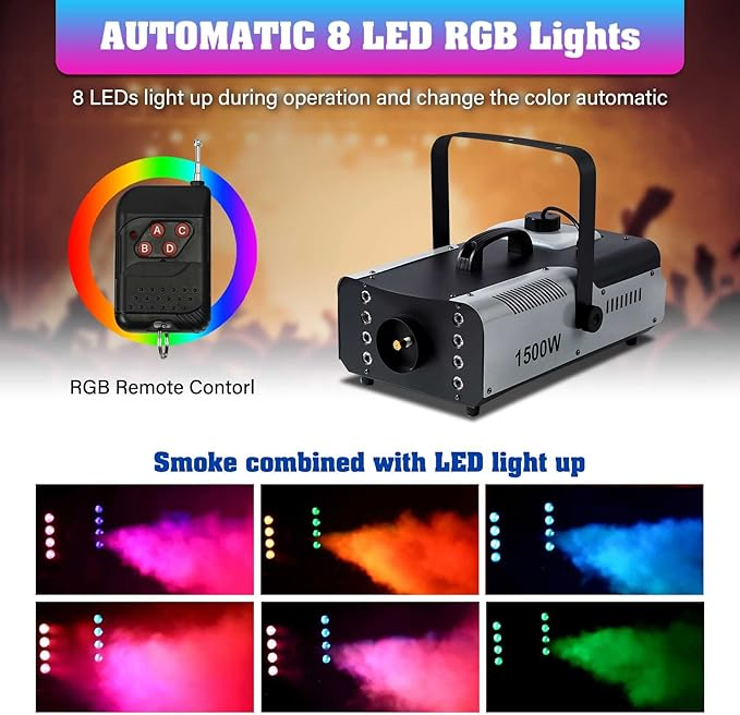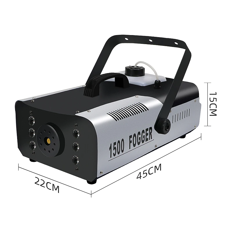 دستگاه مه ساز 1500 وات  : یک ماشین تولید مه یا دود و یا بخار می باشد که با تبخیر مایع مخصوص مه ساز می تواند فضای یک مهمانی را مه آلود کند و هنر نمایی انواع رقص نور ها را دو چندان کند ، بی شک عدم وجود این دستگاه ، قابلیت های متنوع و جذاب رقص نور ها را نمایان نمی کند . لوازم جانبی همراه این دستگاه علاوه بر کابل و براکت نصب ، شامل پدال سیمی ، رموت و گیرنده وایرلس فرمان ، برای ایجاد مه در فواصل زمانی متعدد می باشد. استفاده از مایع مرغوب که در همین مجموعه قابل تهیه می باشد ، به دوام و کاربرد بهتر این دستگاه کمک می کند .